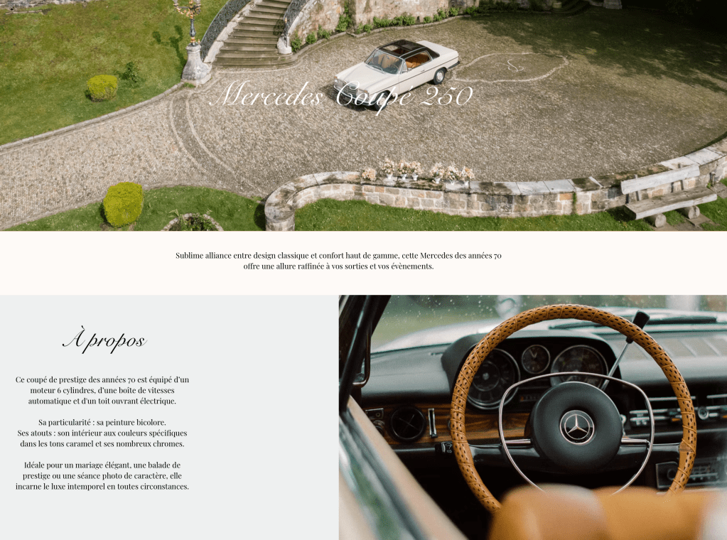 J’ai pris le parti de refondre le menu et les pages du site en reconstruisant une sitemap claire à partir de la Home page. Après une analyse via la Google Search Console et Semrush, j’ai choisi d’ajouter les pages « , « A propos », « Prestations » « Contact » ou encore « Véhicules ». Parallèlement, j’ai fait disparaître la page Tarifs au profit d’un formulaire de demande d’informations, reconstruit le catalogue de véhicules et apporté de nouvelles idées de prestations.