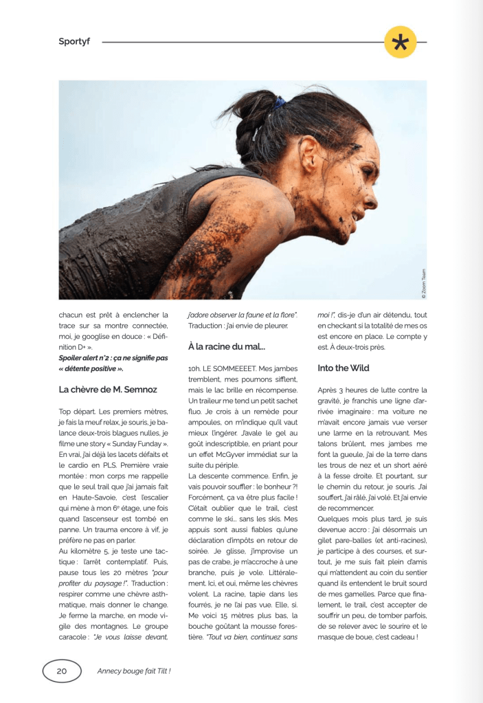 Et un article plus personnel et billet humoristique sur la découverte du trail comme pratique sportive annécienne : pages 18 à 20.